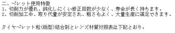 3、同じ摩耗度の硝材について、研磨加工の條件もそれぞれあります、結(jié)合剤を選択するとき、弊社の技術(shù)と相談して決めること。