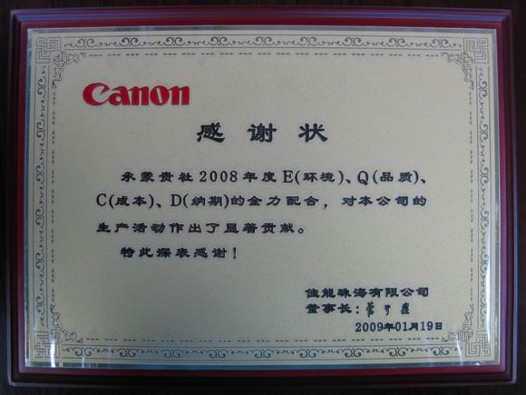 ??????? 參加會(huì)議的40家供應(yīng)商中,機(jī)械、鏡片、輔材企業(yè)20家,電氣企業(yè)20家,佳能珠海對(duì)此40家企業(yè)頒發(fā)了感謝狀。佳能珠海有限公司特別表彰了2家最佳供應(yīng)商。